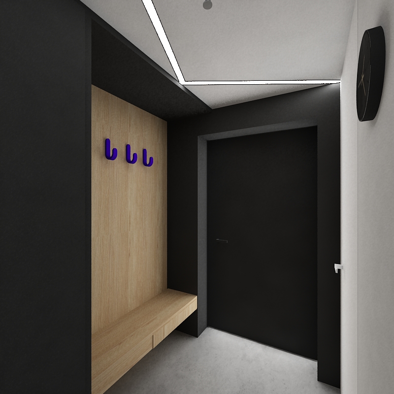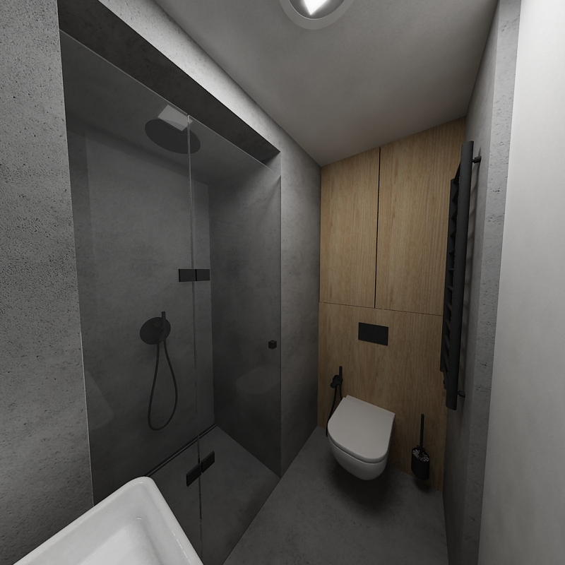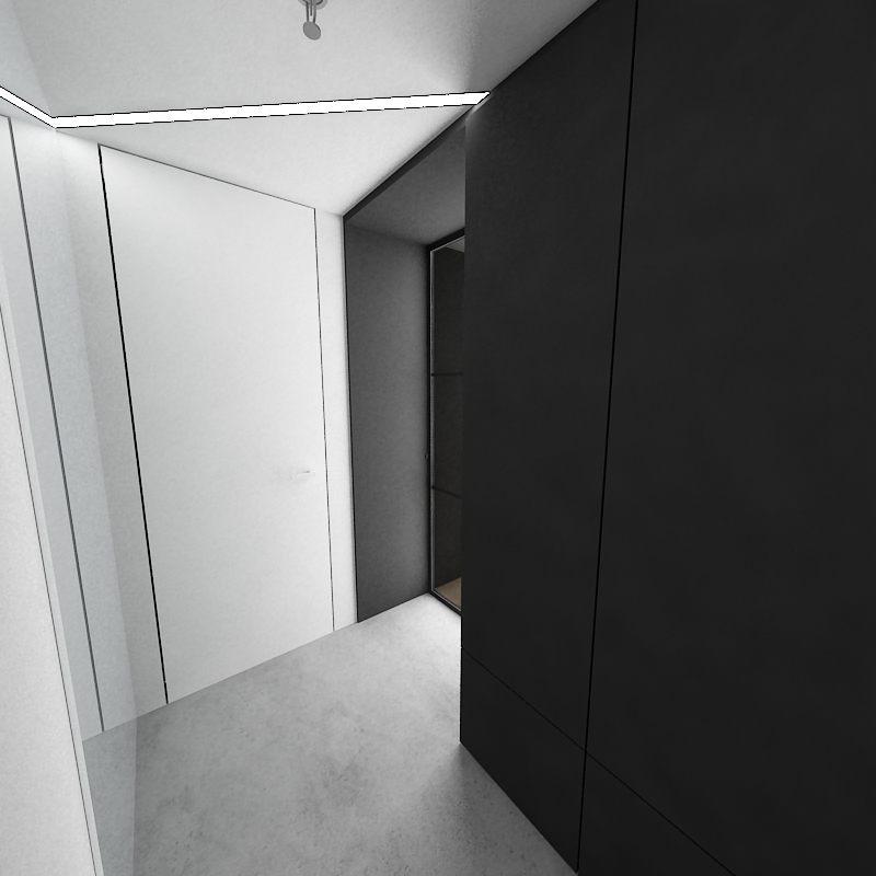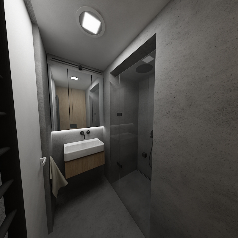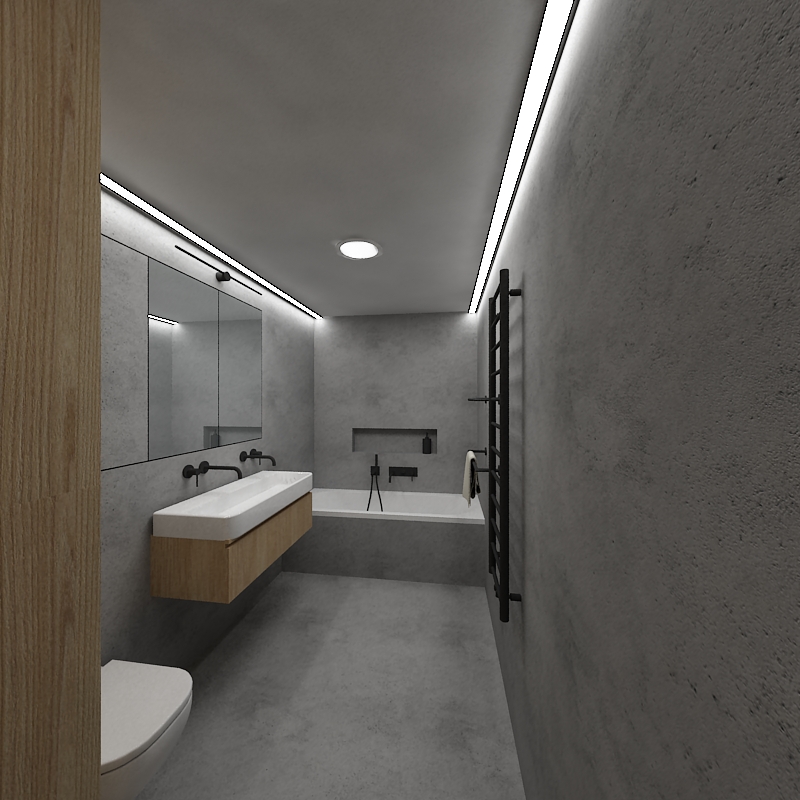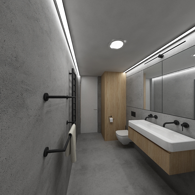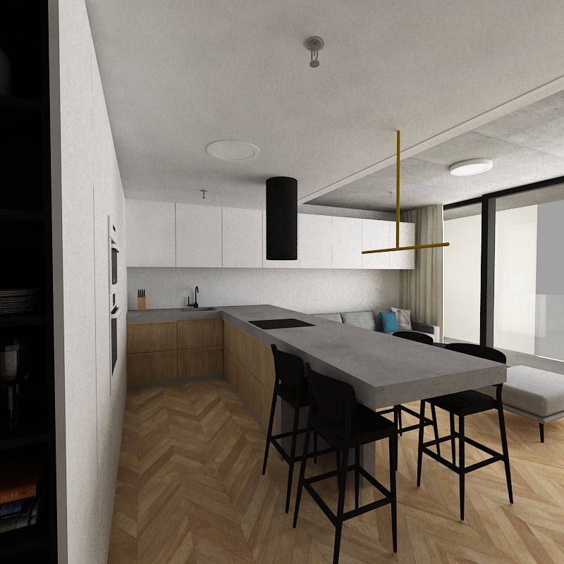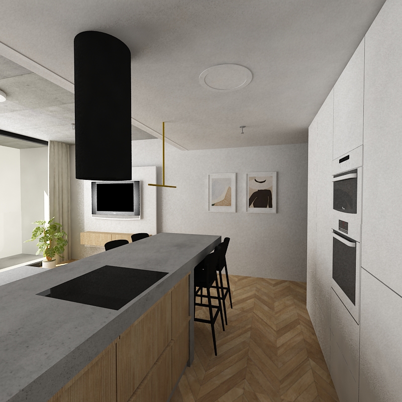 Samotný byt má dispozici 3+kk, se dvěma koupelnami. Požadavkem klienta byl moderní minimalistický design a nenáročnost údržby bytu. Z tohoto důvodu jsem zvolila řešení, kdy většina úložných prostor je zavěšených nebo vestavěných do nik, s minimem otevřených polic. V celém bytě jsou použity dveře do skrytých zárubní na celou výšku mísnosti, skryté sokly, osvětlení je z velké části zapuštěné do podhledů a nábytku. Interiér je laděn do neutrálních barev s dominující černou, šedou, bílou a přírodním dubem. Jelikož vybavení je omezeno na nutné minimum, je zde kladen důraz na prvotřídní materiály, které bytu dávají osobitý charakter - betonové stěrky na podlahách i stěnách koupelen, přiznané betonové stropy a masivní dřevěné podlahy v obytných místnostech, lakovaný nábytek. Tento základ je možné doplnit barevným solitérem, nebo ponechat čistě naturální, v duchu japandi stylu.